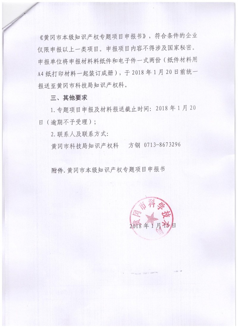 關(guān)于組織申報2017年度黃岡市本級知識產(chǎn)權(quán)專題項目的通知