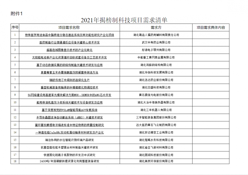科技項目揭榜制是科研項目組織方式的創新機制,旨在組織引導省內外優勢科研力量,聚焦我省光芯屏端網、先進制造、生物醫藥等重點產業,攻克產業“卡脖子”瓶頸,加快取得一批創新性強、應用效果好的標志性技術、產品和服務。按照《湖北省科技項目揭榜制工作實施方案》安排,經形式審查和專家評審,省科技廳共遴選出100個揭榜制科技項目需求(見附件1)予以發布。現就做好揭榜工作有關事項通知如下: